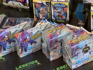 Bowman draft also highlights some of mlb s top prospects. Super jumbo boxes feature five packs of 120 cards. Bleday riley greene cj abrams nick lodolo shea langeliers and many others. There is also the hta choice format which only has three cards in every box but all these cards are autographs.